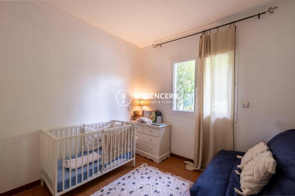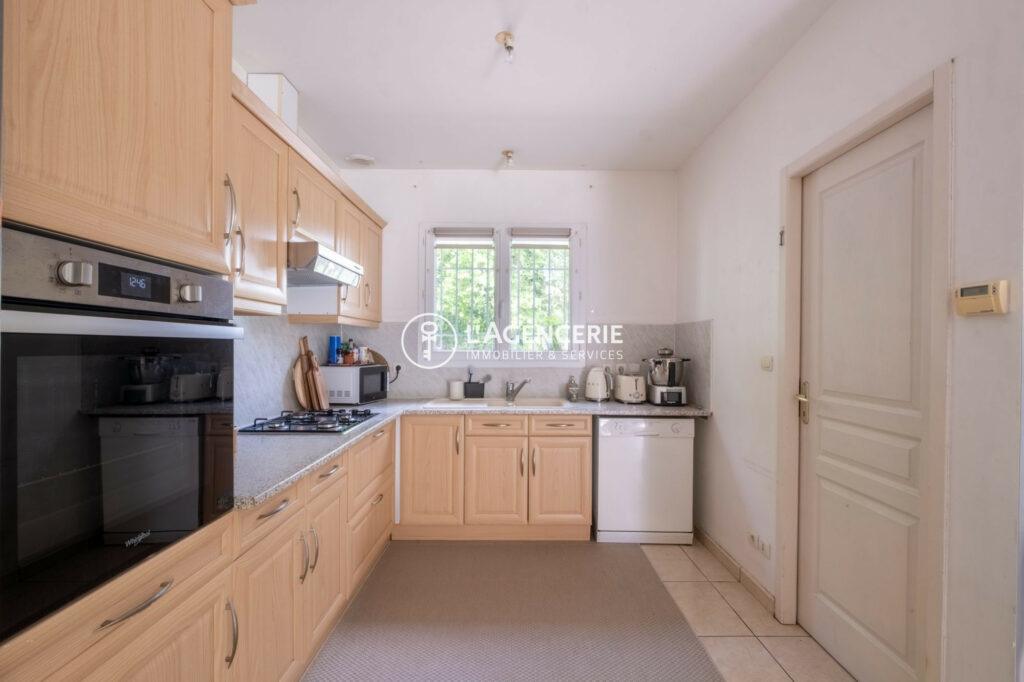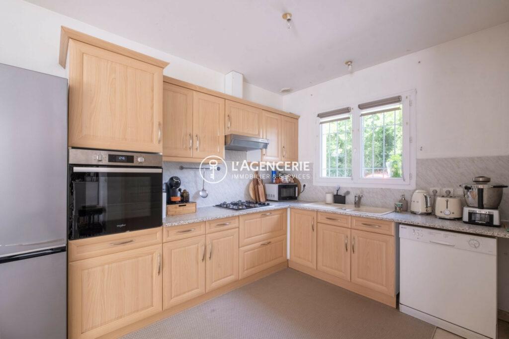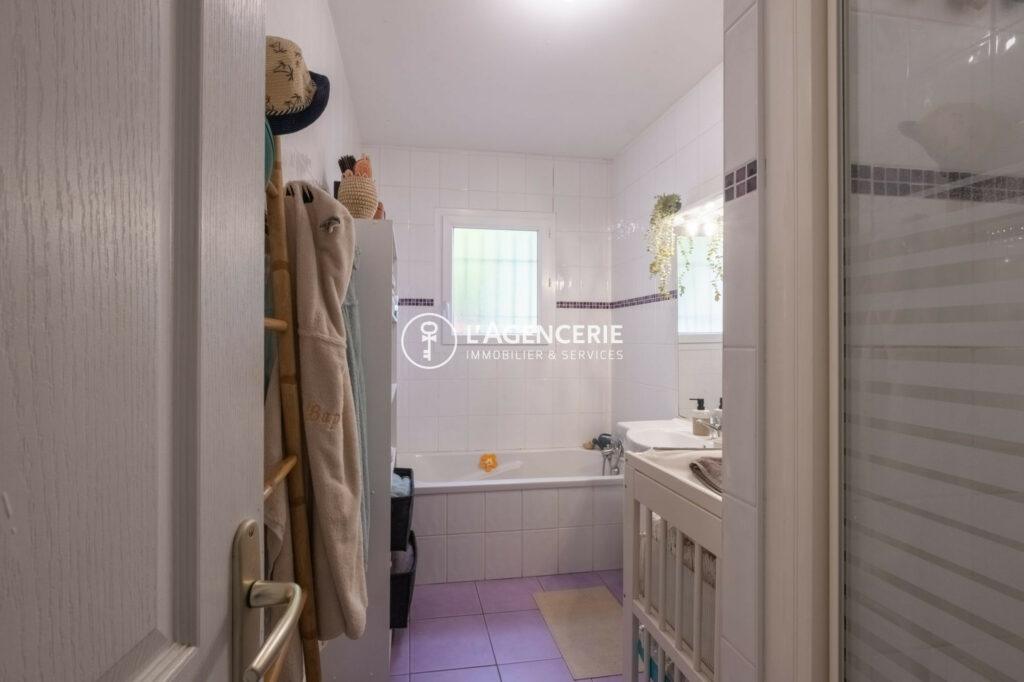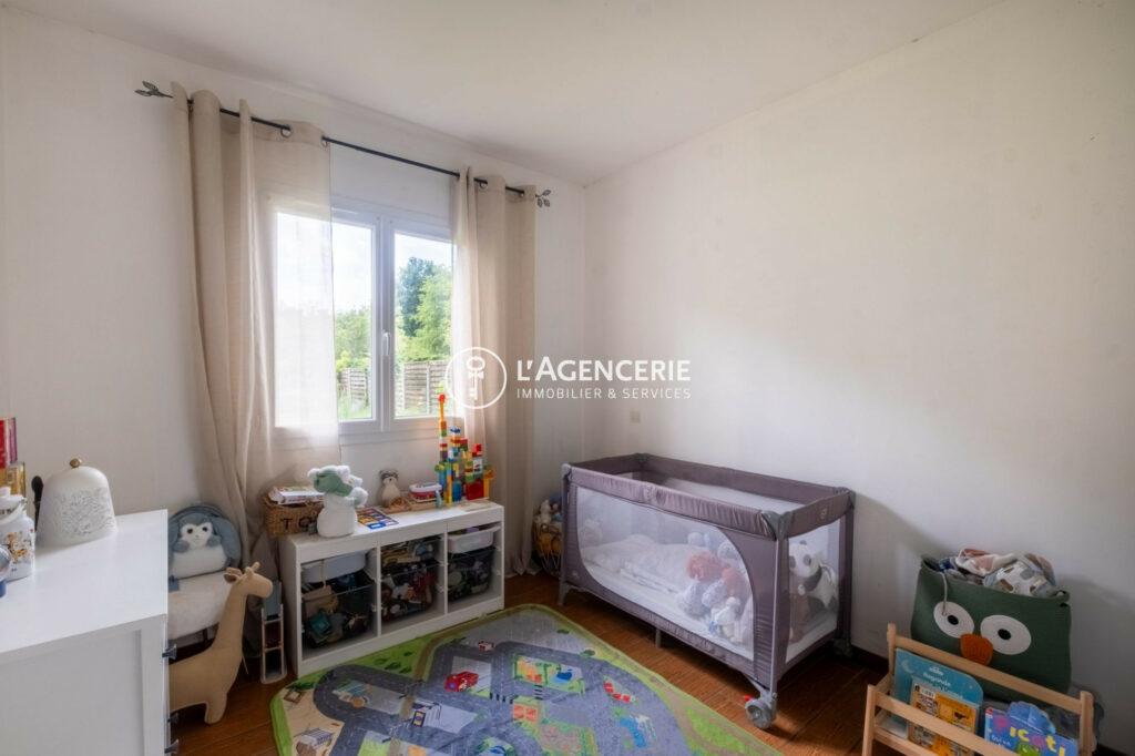 L’espace nuit se compose de trois chambres, dont deux équipées de rangements intégrés. La salle de bains est pourvue d’une baignoire, d’une douche et d’une vasque. Les toilettes sont séparées pour plus de commodité. Un garage attenant offre des solutions de stationnement ou de stockage supplémentaires.